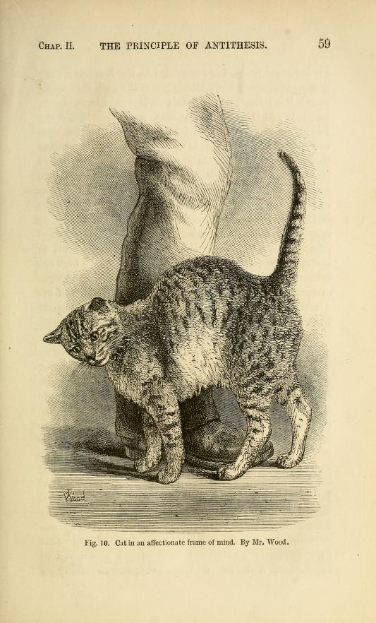 Recently I’ve found myself interested in Charles Darwin’s 1872 book The Expression of Emotions in Man and Animals. This is in no small part because of its charming illustrations of cats and dogs in a variety of emotional states. In the book, Darwin closely describes the bodily signs of emotion shown in different species to tease out the innate and learned basis for them.